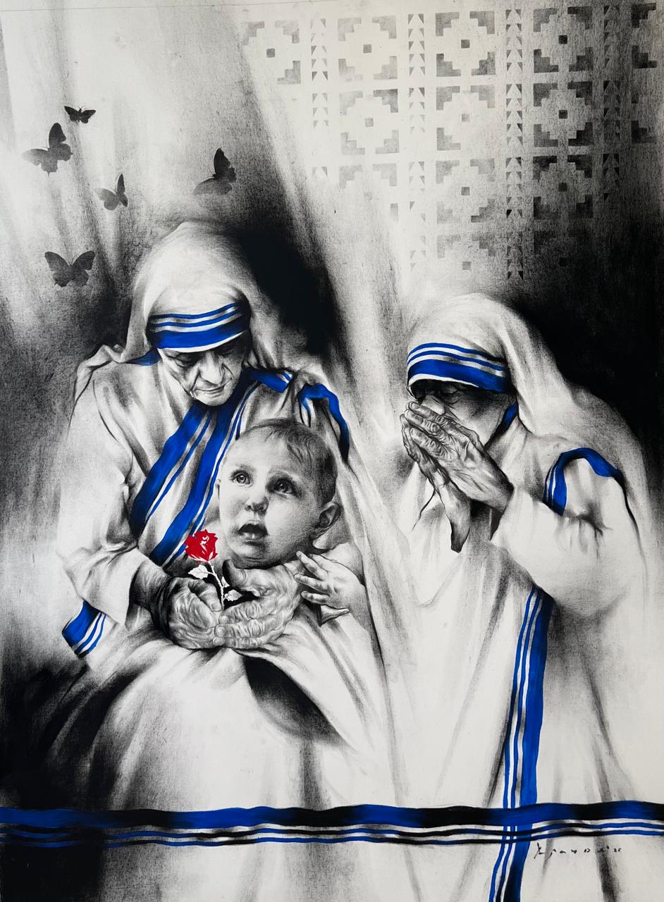 With my charcoal and a dash of sapphire, I capture Mother Teresa as a manifestation of empathy and grace. In a whirlwind world, her simplicity and kindness have been a calming force and a profound inspiration. Through each stroke of my hand, I tried to reflect on the compassion she offered to countless lives.